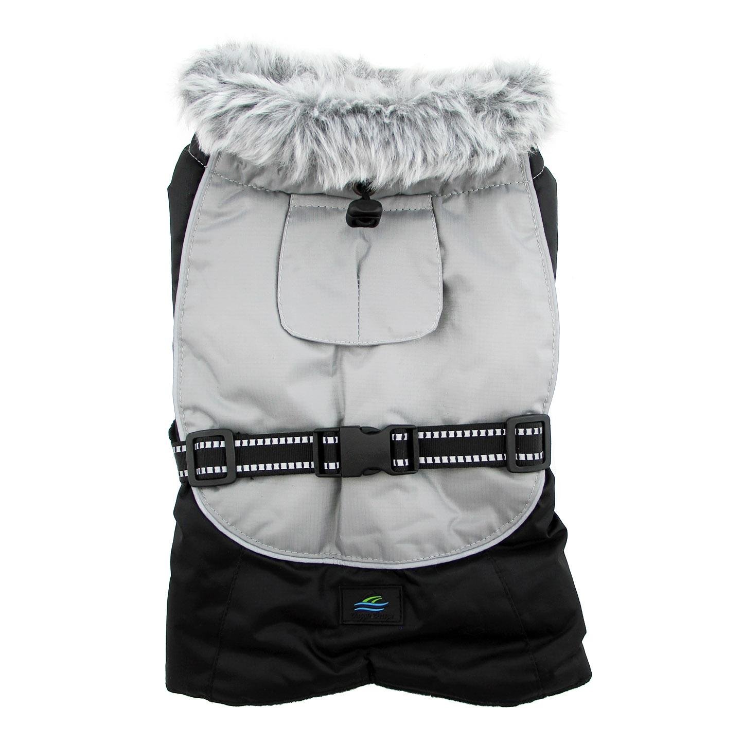 They come with adjustable straps, covered d-ring access hole, fur lined collar with neck cinch, and reflective night safety straps and trim.